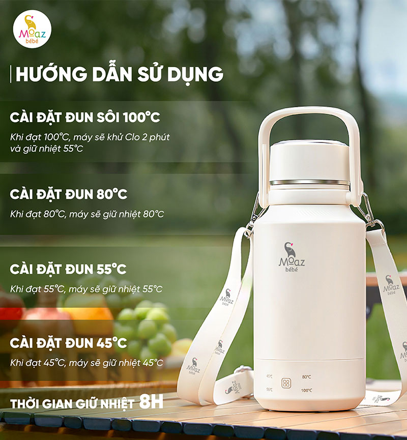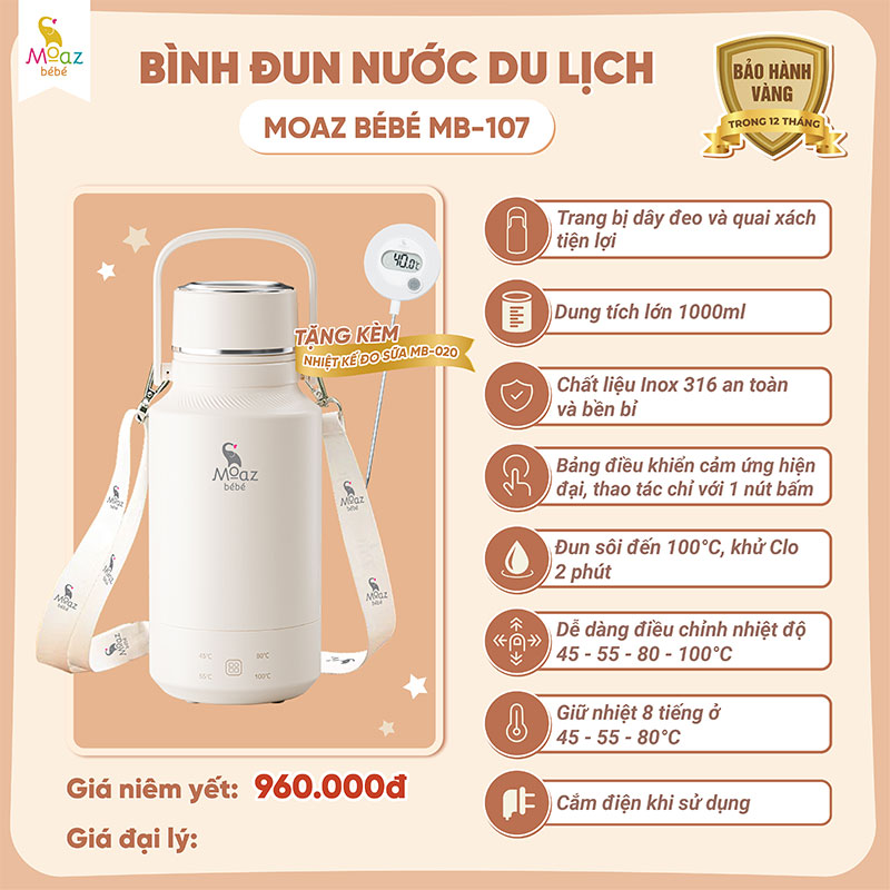Bình đun nước du lịch Moaz BéBé MB – 107 sản phẩm lý tưởng cho những chuyến du lịch của cả gia đình, khi sở hữu dung tích tới 1000ml, đun sôi đến 100°C và khử clo 2 phút. Đồng thời có thể cài đặt nhiều mức nhiệt khác nhau 45 – 55 – 80 – 100°C, chỉ cần 1 nút bấm đơn giản. MB – 107 còn có chức năng giữ nhiệt, để gia đình luôn sẵn sàng có nước khi cần thiết. Bình có kiểu dáng đẹp, đi kèm quai xách lẫn dây đeo chéo tiện lợi, dễ dàng mang đến nhiều nơi.